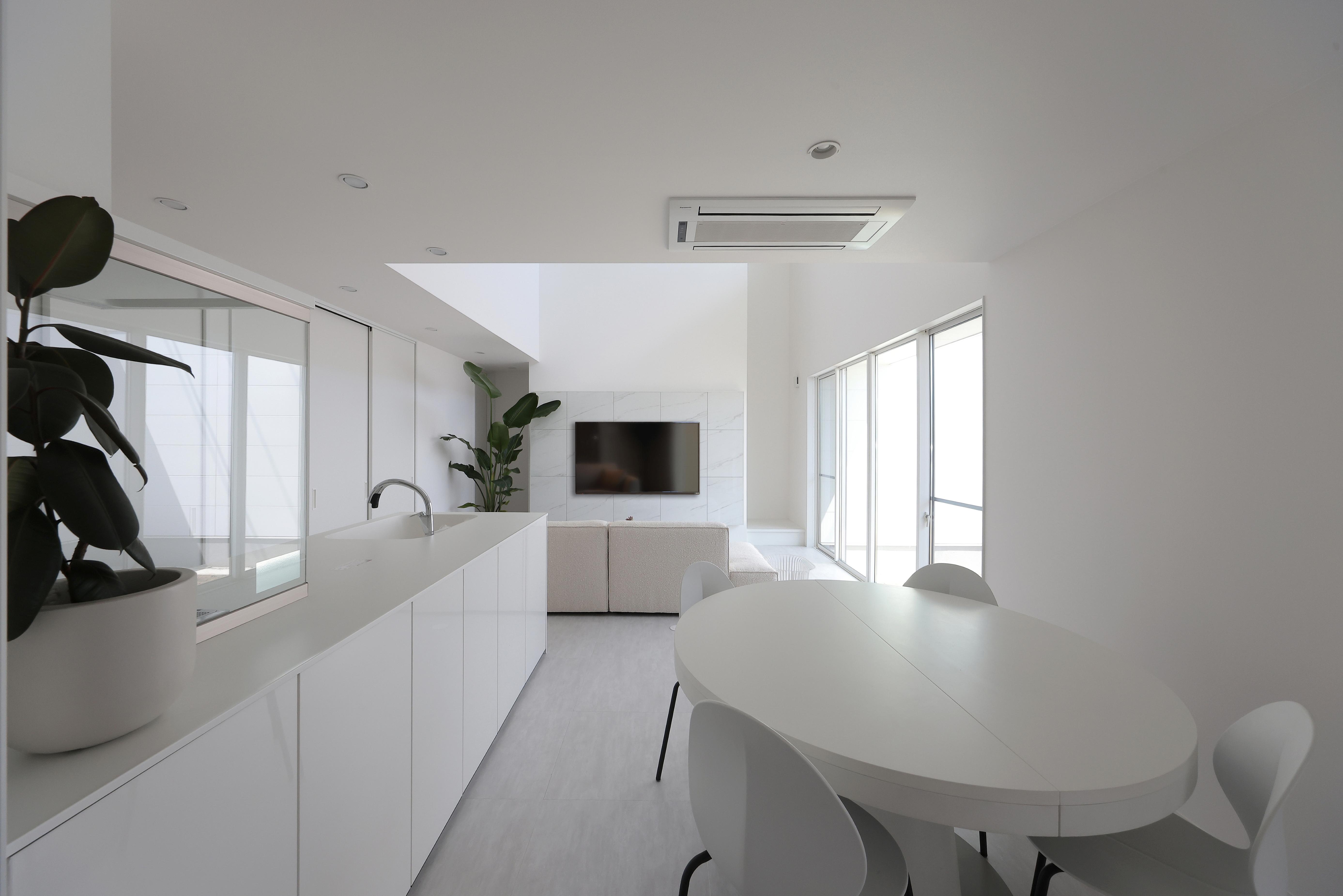 キッチンとひと続きのダイニングは、光と視線がやわらかく交わる、穏やかなコミュニケーションの場。白で統一された空間の中に、家具や植物の陰影がやさしく浮かび上がります。日々の食卓が、暮らしのリズムを整える時間となるように設計しました。