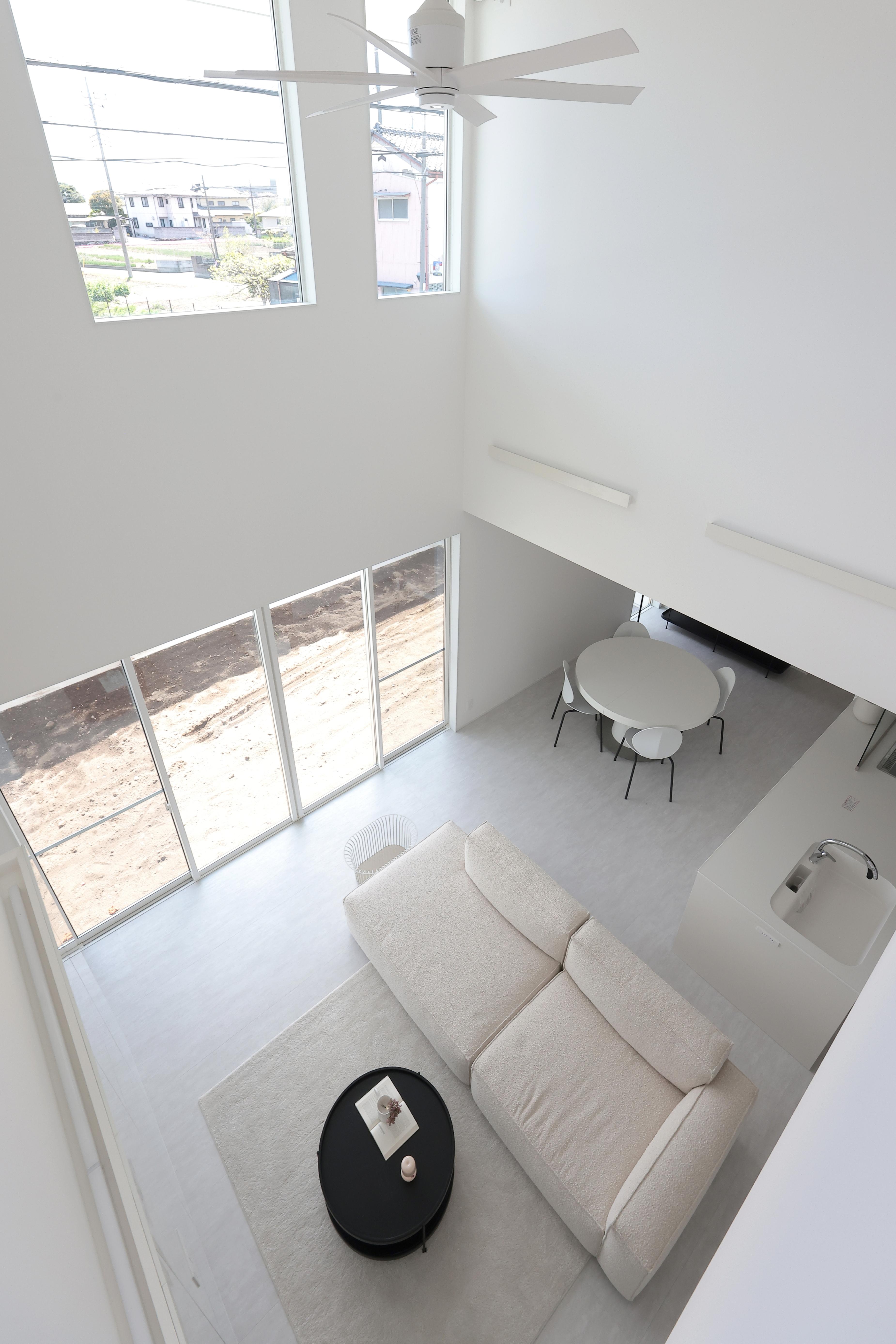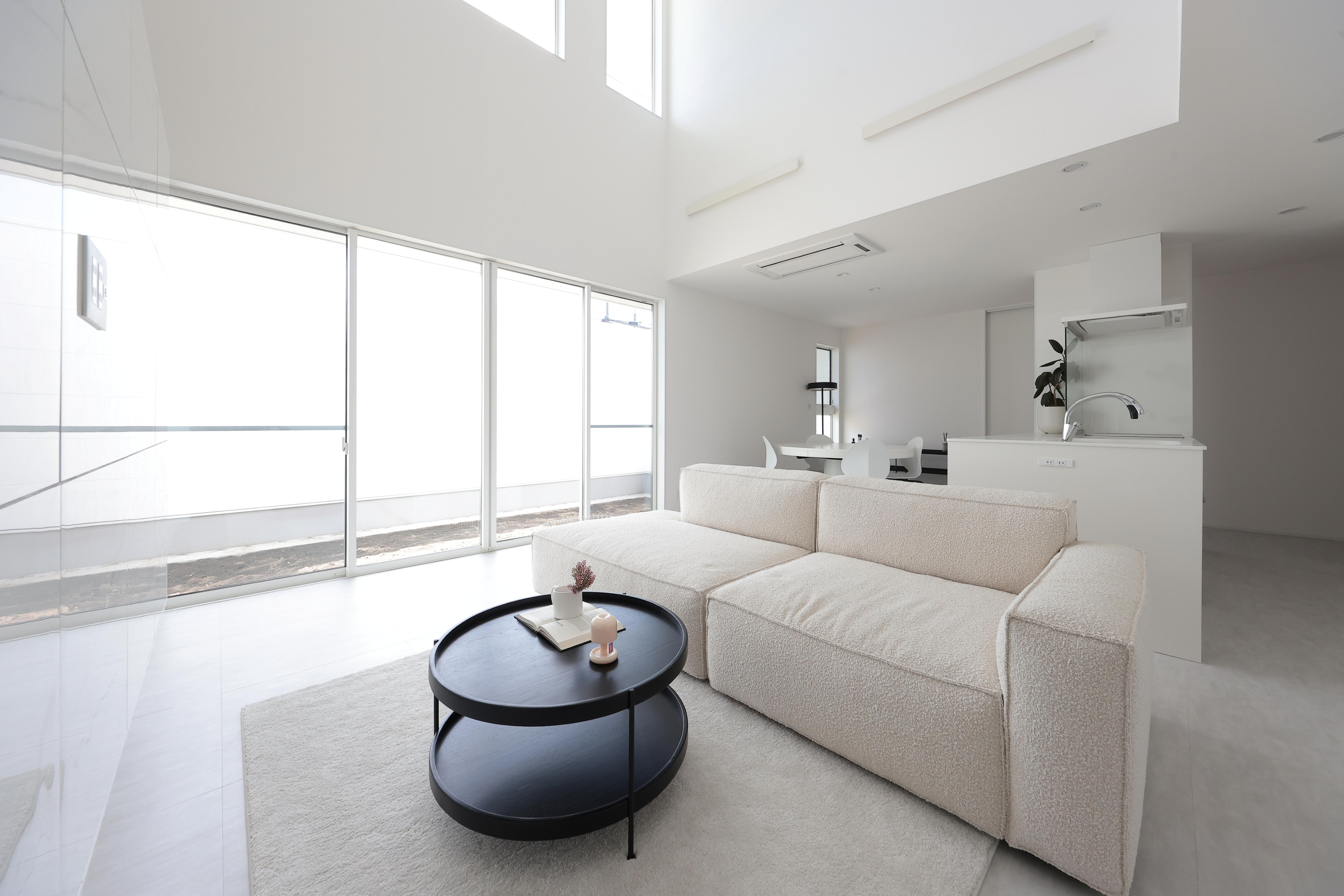 大きな開口部から自然光がやわらかく差し込む、開放的な吹き抜け空間。白を基調とした室内に、陰影が静かに移ろい、時間の流れを感じさせます。家具の存在も余白の一部として溶け込み、日常に穏やかなリズムをもたらすリビングです。