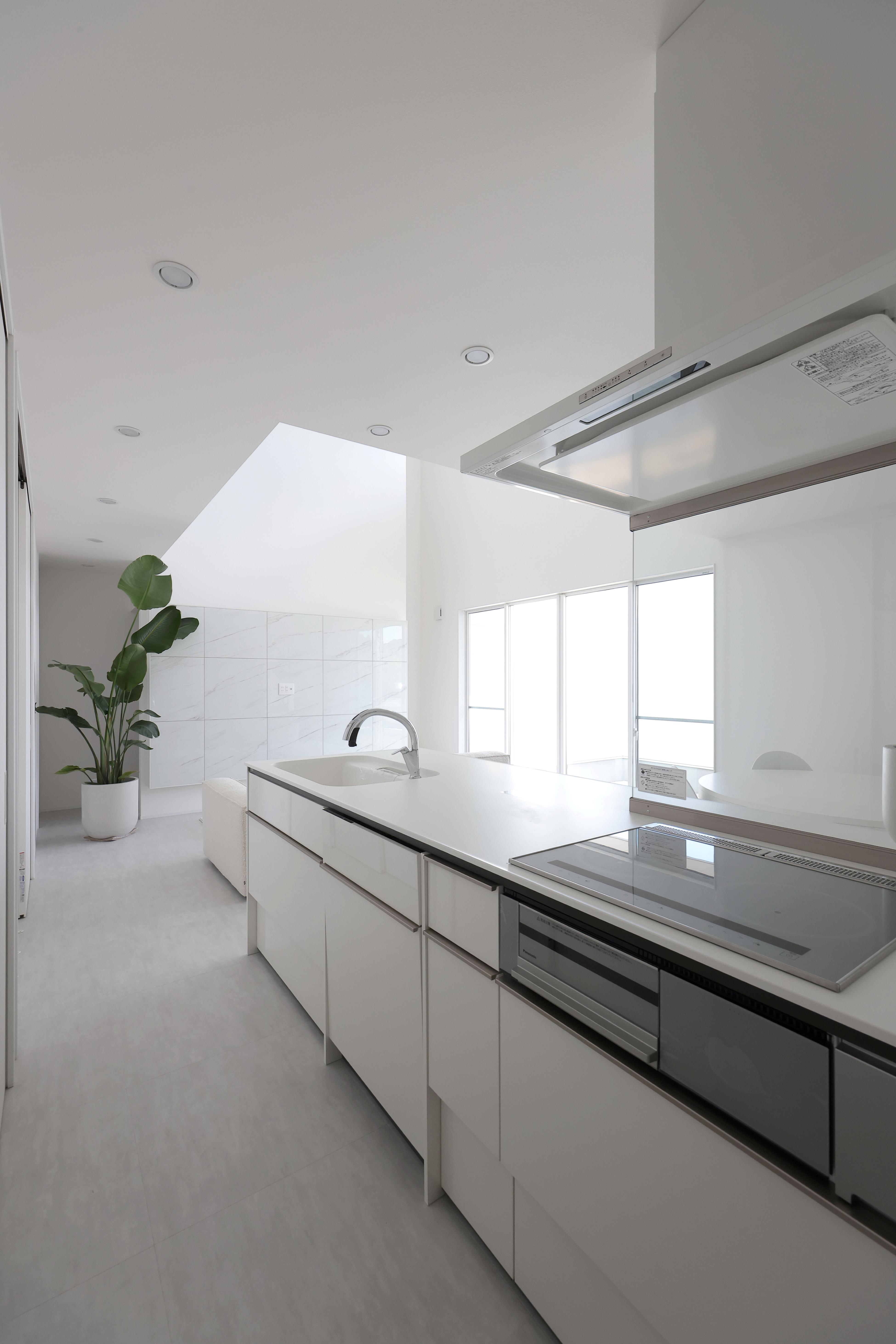 白で統一された空間に、直線的なラインが際立つキッチン。余計な装飾を排したデザインは、道具としての美しさを引き立て、暮らしの動きを自然に導きます。光を反射する面が、時間ごとに異なる表情を映し出す空間です。